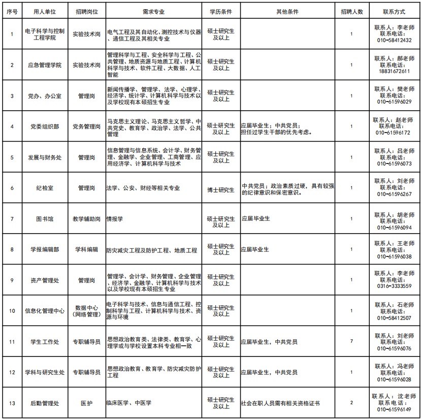 其他岗位的硕士研究生受聘人员按非事业编制人员管理,学校委托北京防灾科技有限公司与硕士研究生受聘人员签订劳动合同,合同期限为3年,其中试用期为6个月,人事档案和户口不转入学校,党团组织关系根据工作需要可转入学校。